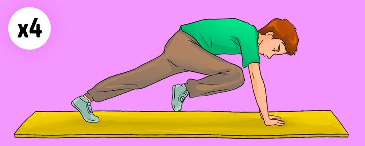 Почніть з «Скелелаза». Встаньте в положення планки. Підтягніть одне коліно до грудей так близько, як зможете. Повторіть рух іншим коліном. Виконайте 4 рази обома ногами.
