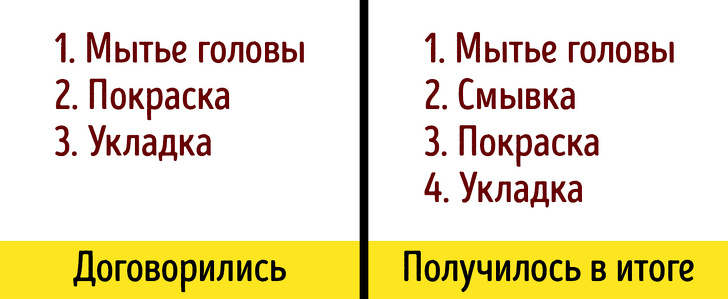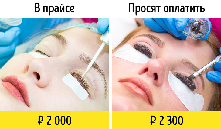 У деяких салонах вдаються до хитрощів: надають послугу, про яку клієнт не просив, і потім сміливо заявляють, що її потрібно сплатити, коли від готової роботи вже не відмовитися. Приміром, можуть нанести маску після фарбування, виконати легкий масаж голови або зробити змивку, про яку на початку не було й мови.