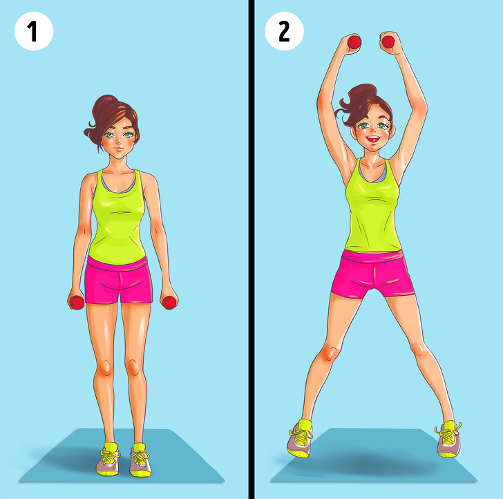 Встаньте прямо, в кожну руку візьміть невелику гантель. На рахунок «раз» стрибніть, розвівши ноги в різні сторони, а руки підніміть над головою. На рахунок «два» прийміть вихідне положення. Зробіть 3-4 підходи по 15-20 разів.