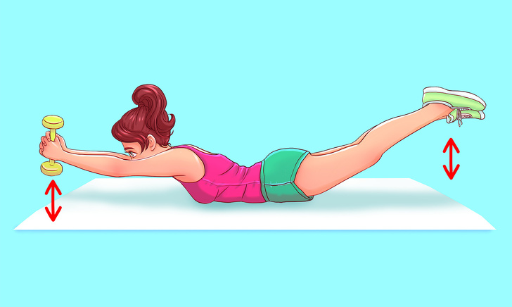 Лежачи на животі витягніть руки і ноги. Для обважнення можете взяти в руки 1 або 2 гантелі. На рахунок «раз» підніміть руки і ноги від статі, затримайтеся в такому положенні приблизно 3 секунди і на рахунок «два» прийміть вихідне положення. Зробіть вправу 10-12 разів.