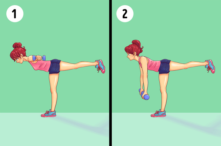 Візьміть гантелі в руки і встаньте рівно, поставивши ноги разом. Тримайте спину рівно і нахиліться вперед, витягнувши праву ногу назад. На рахунок «раз» розведіть руки в сторони. На рахунок «два» повернутися в положення, коли кулаки з гантелями дивляться вниз. Зробіть 10-15 разів, періодично змінюючи ногу.