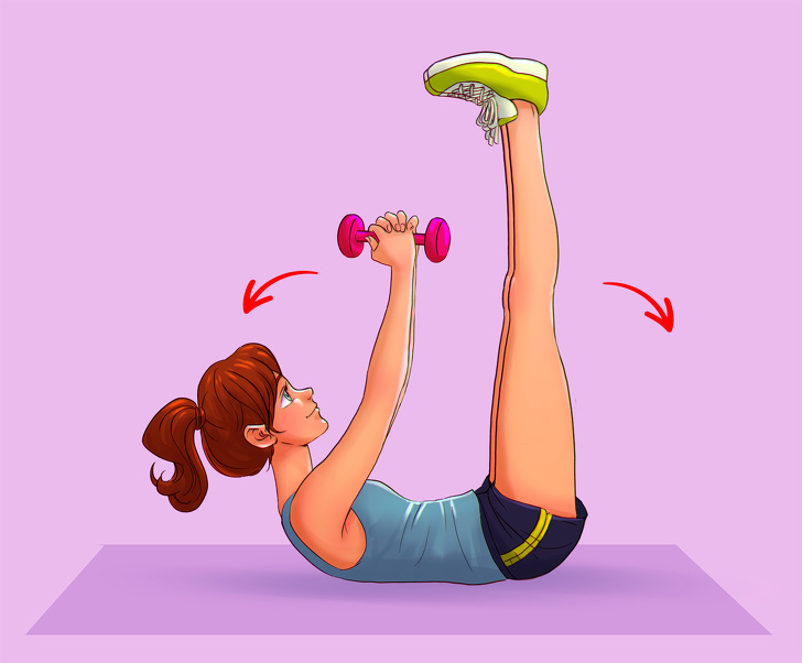 Візьміть гантелі і ляжте на спину. На рахунок «раз» підніміть руки і ноги вгору, слідкуючи, щоб плечі максимально піднялися над підлогою. На рахунок «два» повільно поверніться у вихідне положення. Зробіть 10-12 разів.