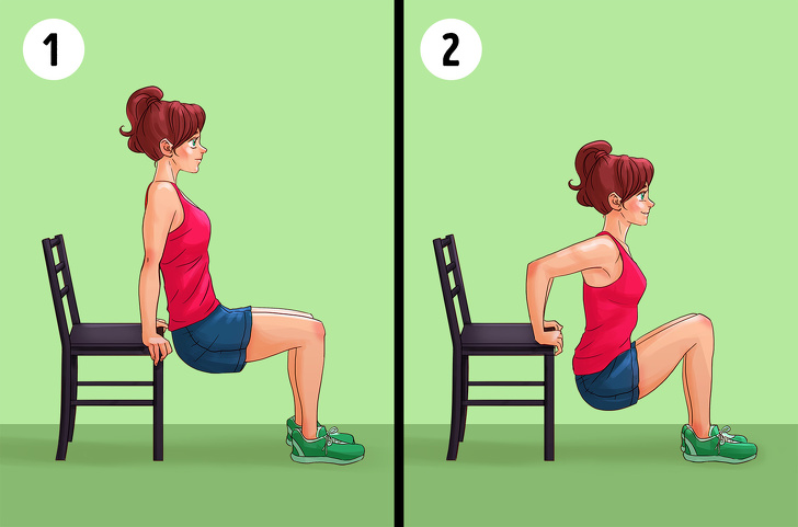 Поставте руки на стілець строго за плечима, зігніть ноги в колінах. На рахунок «раз» плавно опуститеся вниз (стежте, щоб плечі були паралельні підлозі, а лікті дивилися назад). На рахунок «два» акуратно підніміть корпус у вихідне положення, напружуючи прес. Зробіть 3-4 підходи по 15-20 разів.