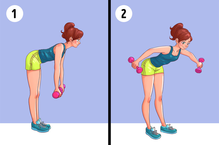 Візьміть гантелі в кожну руку. Встаньте прямо, ноги на ширині плечей і трохи зігнуті в колінах. Нахиліться вперед і опустіть руки вниз. На рахунок «раз» розведіть їх боку, як би злітаючи (лікті злегка зігнуті), і затримайтеся в такому положенні на 2 секунди. На рахунок «два» повернутися у вихідне положення. Зробіть 3-4 підходи по 15-20 разів.