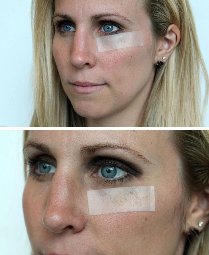 Так-так, це не помилка. Пластир або липку стрічку необхідно розмістити під оком перед нанесенням тіней, щоб деяка їх частина не опала на обличчя. Більш детально про спосіб читайте тут.