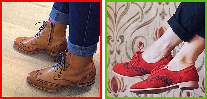 Черевики і напівчеревики з перфорацією у вінтажному стилі (броги) користуються любов'ю покупців вже не один сезон. Однак чоловікам здається, що жінка в брогах виглядає так, наче поспіхом влізла в татусеві робочі черевики. Цей вінтажний тренд здається їм занадто важким. Правильно поєднувати грубі класичні броги з жіночим одягом досить складно. Тому краще спочатку вибирати моделі більш елегантних форм і відтінків.
