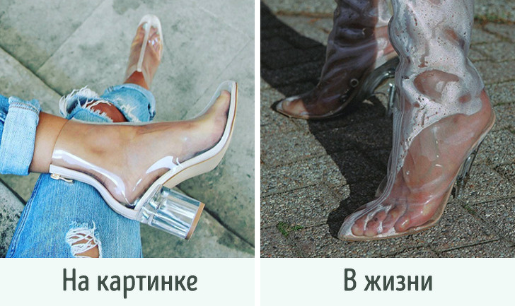 Взуття з прозорими елементами або навіть повністю прозора — це ще один тренд, до якого потрібно підходити особливо обережно. Тут проходить дуже тонка грань між містечковим стилем і справді модним витонченістю. Тим більше що пластикова взуття може бути шкідлива для здоров'я: у неї нога зовсім не дихає, а це ідеальні умови для розмноження бактерій. Крім того, пластик не разнашивается, тому таке взуття може не на жарт натирати.