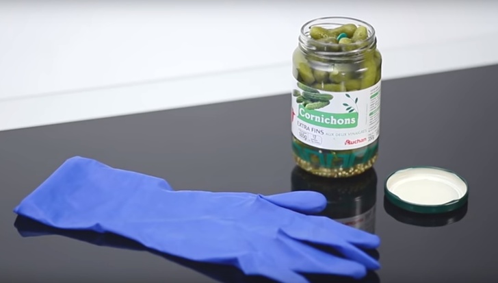 Дістатися до вмісту банки можна всього за кілька секунд. Раніше ми розповідали вам, що можна акуратно підчепити кришку столовою ложкою і випустити з банки трохи повітря. А в цьому відео є ще один лайфхак, який можна взяти на озброєння. Щоб швидко розправитися з тугою кришкою, досить надягти на руку звичайну гумову рукавичку. Прокладка з гуми знижує ризик прослизання руки, і кришку вдається повернути з першого разу.