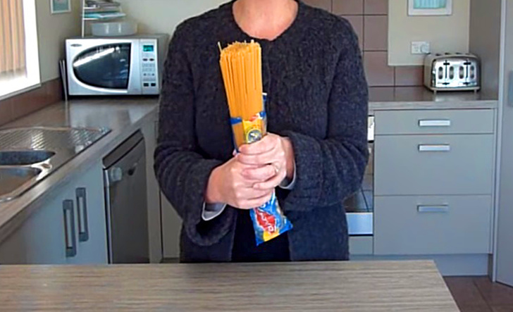 Виявляється, достатньо просто взяти пачку зі спагеті, розгорнути вертикально і сильно стукнути нею по столу. Макарони самі прорвут упаковку та «вирвуться на свободу». Головне-міцніше тримати пачку, щоб її вміст не розлетілося в різні сторони. В самому відео — один спосіб, а ще можна просто вдарити нижньою частиною долоні по дну упаковки.
