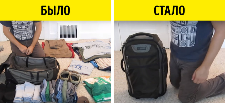 Сорочки, взуття, шкарпетки, білизна, пара светрів... Здається, що для всього цього багатства потрібна величезна дорожня сумка. Насправді ж всі речі можна легко розмістити в звичайному рюкзаку, головне — грамотно складати їх (наприклад, як показує досвідчений мандрівник Тому Айзенберг).