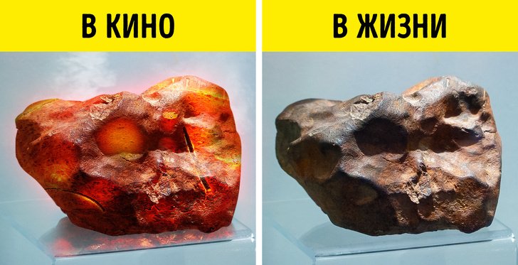 Ще одна часто зустрічається в кіно деталь — палаючий метеорит, який нібито тільки що впав на Землю. В житті все виглядає інакше. 9 з 10 падаючих на Землю метеоритів — камені, які володіють дуже слабкою теплопровідністю. Тепло від зовнішніх шарів не встигає за кілька секунд польоту в атмосфері передатися внутрішньої частини небесного тіла. Більш того, холодний центр каменя зсередини остуджувати його. Тому тільки що впав метеорит може бути максимум теплим, але ніяк не розжареним.
