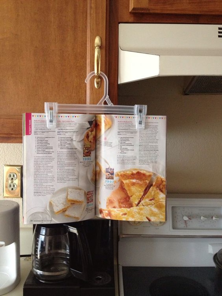 Якщо ви готуєте по кулінарній книзі, то знаєте, як незручно постійно бігати до неї і мити руки, щоб перегорнути сторінку. Щоб рецепт був перед очима і не потрібно було відволікатися від приготування страви, прикріпіть книгу до вішалки і розташуйте на рівні очей.