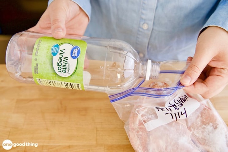 Швидше розморозити м'ясо допоможе білий оцет. Потрібно залити ним м'ясо, поміщене в пакет. Оцет знижує температуру замерзання м'яса, за рахунок чого воно швидше розтає. А заодно стане м'якше.