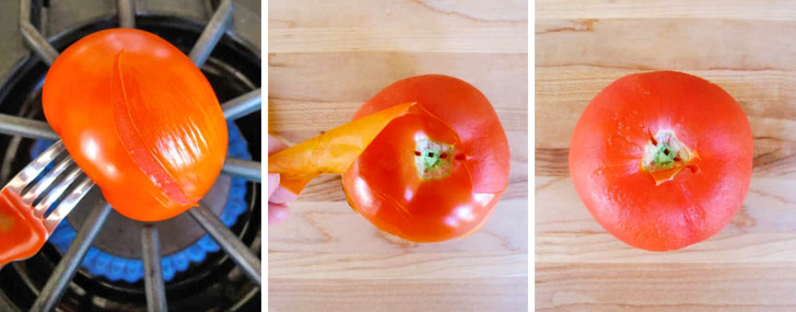 Є кілька способів очистити помідори від шкірки. Один з них — потримати овоч над газовим пальником 15-25 секунд. Під дією тепла шкірка почне відставати від м'якоті. З іншими способами можна ознайомитися в цій статті.