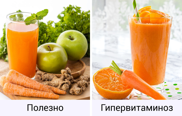 Часто в рецептах морквяного фрешу рекомендують додавати апельсин або гарбуз. І дійсно, таке поєднання дуже смачно і корисно. Однак захоплюватися їм все ж не варто. Оранжеві овочі та фрукти містять велику кількість вітаміну А, а його надлишок може погано позначитися на стані печінки, викликати печію або навіть проблеми з нирками.