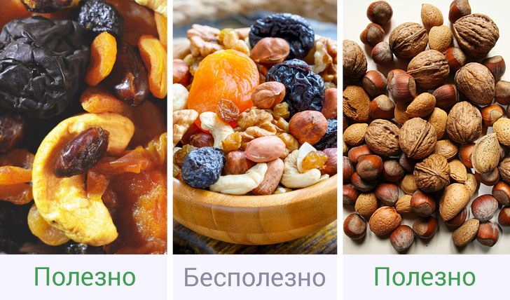 Такий традиційний перекус більшості поборників ЗСЖ не шкодить здоров'ю. Але в поєднанні втрачає частину своєї корисності: фитиновая кислота, яка міститься в горіхах, зв'язує і виводить корисні мінерали, особливо залізо, цинк, магній і кальцій. Тому не варто змішувати мигдаль, арахіс, лісові і волоські горіхи разом з курагою, чорносливом, родзинками та іншими сушеними фруктами і ягодами.