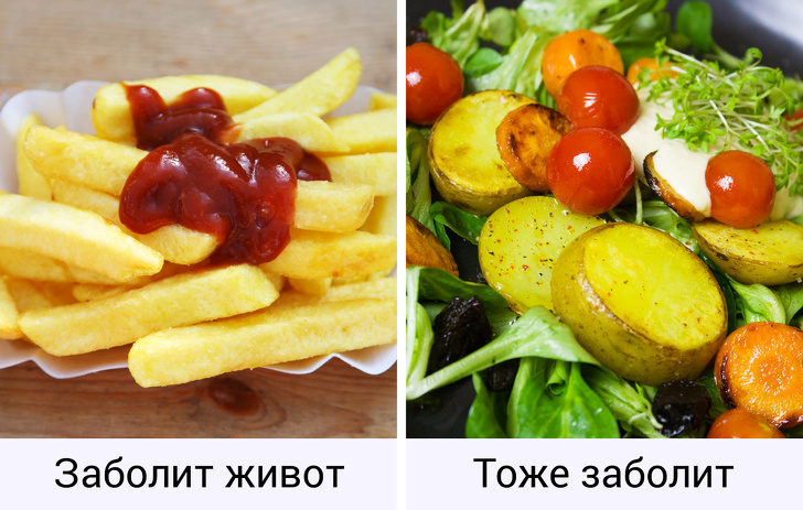 Самі по собі ці продукти поживні і корисні, але в поєднанні крохмалисті продукти, наприклад картопля або рис, і кислота помідорів дуже погано позначаються на травленні. Тому краще не вживати їх в один прийом їжі, якщо не хочете відчути відчуття тяжкості в шлунку, сонливість відразу після їжі.