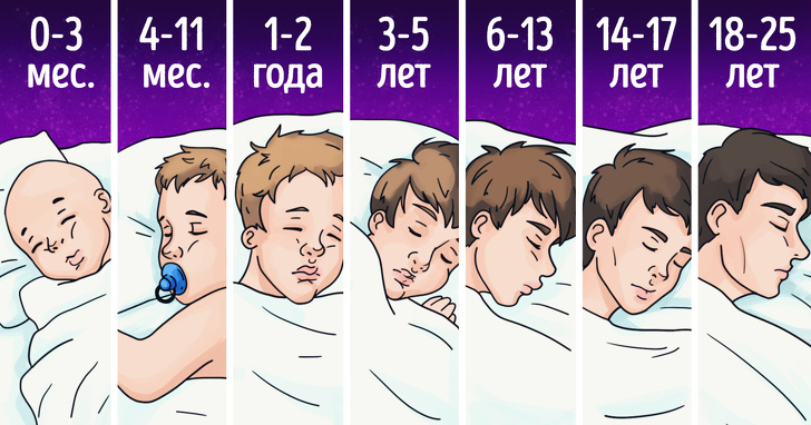 Немовлятам до 3 місяців потрібно найбільшу кількість сну. Дітям і підліткам рекомендується спати не менше 8 годин на добу. А по досягненні 18 років необхідну кількість сну знижується і досягає мінімальних значень після 65 років. Але не варто забувати і про індивідуальні особливості організму, які можуть вносити свої корективи у вказані цифри.