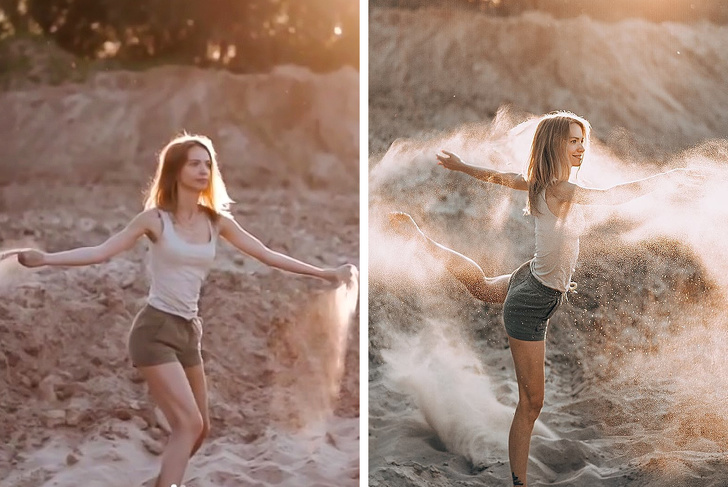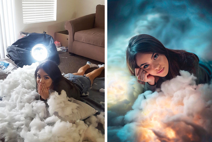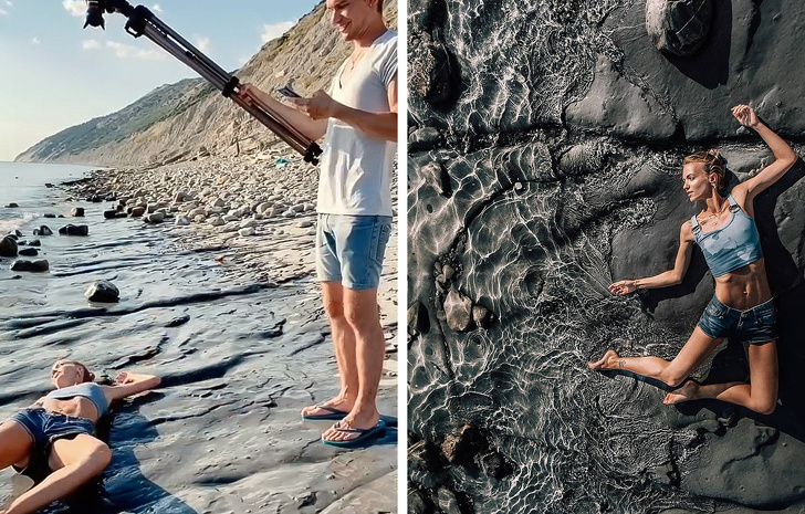 За кожною вдалою фотографією стоїть не тільки кілька десятків поз моделі, але і спритність рук і винахідливість фотографа. Але часто за вау-знімками ховається звичайна реальність, і деякі майстри не соромляться показати в своїх блогах обидві сторони одного знімка.
