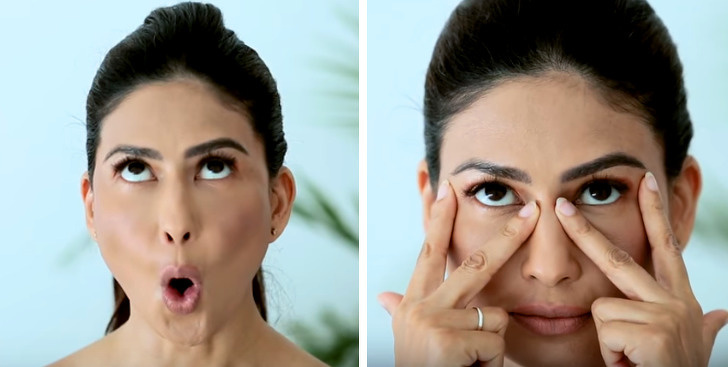 - Притискаємо вказівні пальці рук до зовнішніх куточків очей, а середні — до внутрішнім в районі перенісся. Злегка притримуємо шкіру, спрямовуємо погляд вгору і злегка примружуємо очі, відчуваючи напругу м'язів. Тримаємо 3 секунди, розслабляємо. Повторити 10 разів.