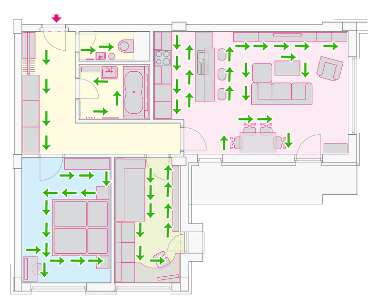 Ми не можемо бачити бактерії, і вони можуть накопичуватися в місцях, які здаються ідеально чистими. Почніть прибирання в окремій кімнаті, рухаючись зліва направо (як на схемі). Так ви ретельно очистіть весь будинок, нічого не пропустивши.
