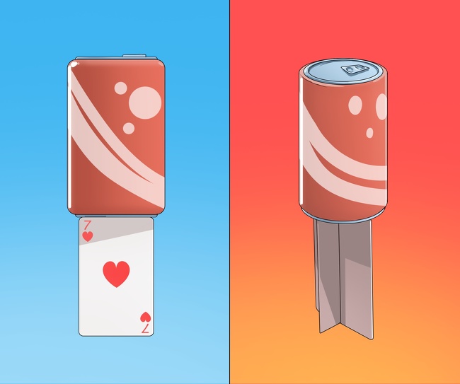 Ілюзіоніст спочатку ставить картку вертикально, а потім якимось незбагненним чином змушує банку газованої води твердо стояти на ній. Це здається неймовірним, хоча насправді це один з найбільш простих фокусів.