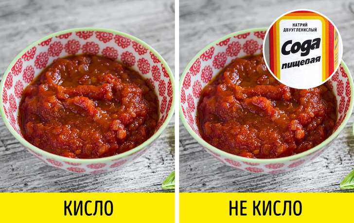 - Занадто кислим маринадів і соусів на основі томатів можна повернути смак, якщо додати до них дрібно порізані цибулю і моркву, змішані з цукром і трохи обсмажені. Сода - один з кращих нейтралізаторів кислоти. Додайте невелику кількість соуси або овочеві страви.