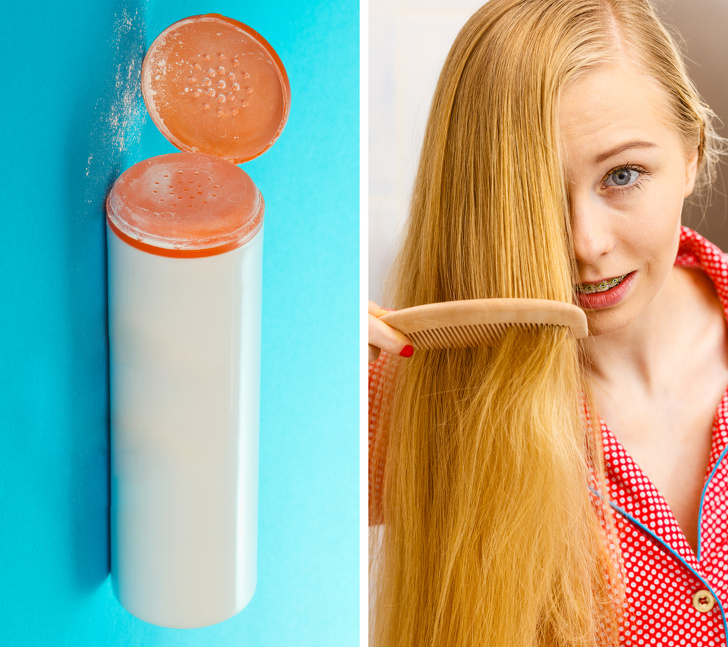 Переваги сухого шампуню вже оцінили багато дівчат. Проте його можна зробити і самостійно. Просто тримайте під рукою дитячу присипку. Цей простий інгредієнт не тільки видаляє жир з волосся, але і додає їм об'єм.
