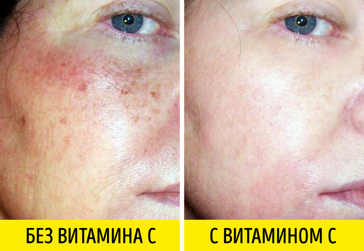 - вітамін С: вирівнює колір обличчя, знімає запалення, бере участь у синтезі колагену;