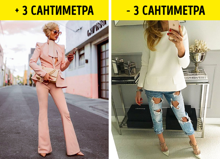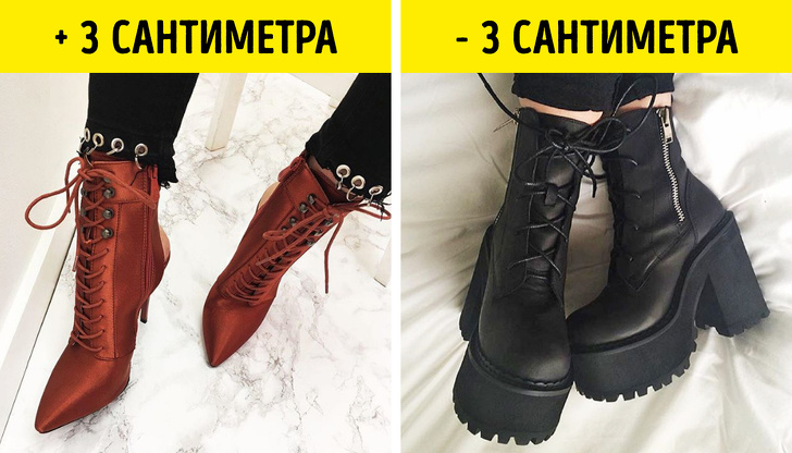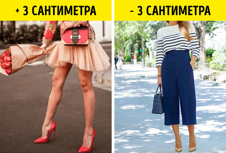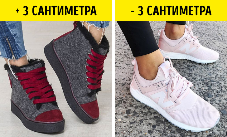 Хороша альтернатива підборів — взуття на прихованій платформі або танкетці. Навіть невелика платформа зробить вас вище, силует — тонше, а ноги візуально довшими. Звичайні кросівки, особливо в поєднанні з укороченими джинсами, навпаки, роблять нижню частину тіла коротше.