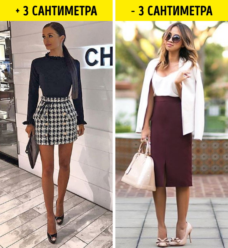 Спідниця вище коліна і каблук, навіть невеликий, візуально додадуть ніг 3-5 див. Однак цей варіант підійде тільки досить струнким жінкам зростанням вище 160 див. Інакше ефект виявиться протилежним: ноги будуть здаватися коротше, а фігура — більшим, ніж є насправді.