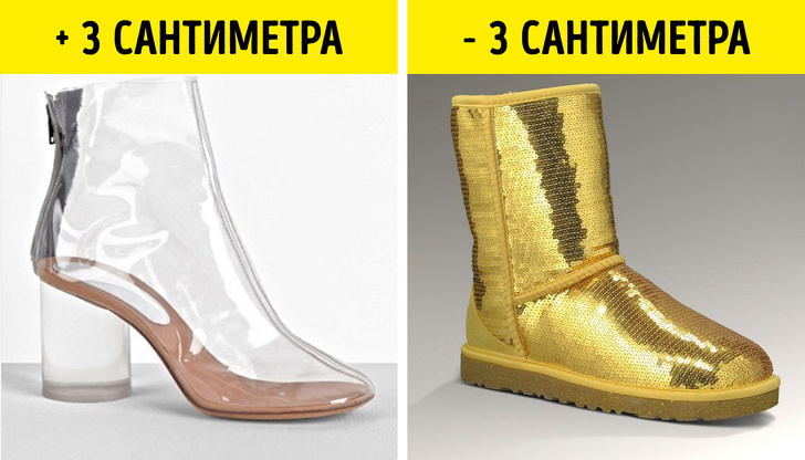 Зробити ноги довші може взуття як нейтральних кольорів, так і повністю прозора. Особливо гарні для цього літні моделі — відкриті туфлі та босоніжки. Якщо не подобаються повністю безбарвні моделі, можна вибирати взуття з подібними деталями, наприклад з прозорим каблуком.