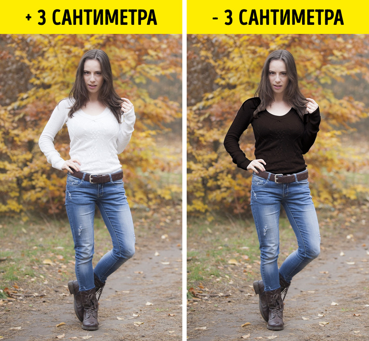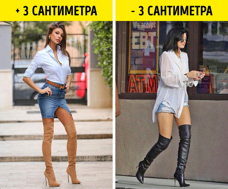 Тут все просто: якщо чоботи виглядають як частина або продовження ноги, вони роблять її візуально довшими. Моделі інших квітів, особливо контрастних, навпаки, візуально ділять ногу на дві частини, тим самим скорочуючи її.