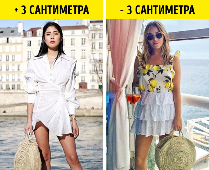 Вертикальні лінії візуально витягають фігуру. Вони не тільки додадуть ніг кілька сантиметрів, але і зроблять вас вище. Горизонтальні лінії, навпаки, вкорочують і ноги, і зростання у цілому, а ще можуть підкреслити зайві кілограми, якщо вони є.