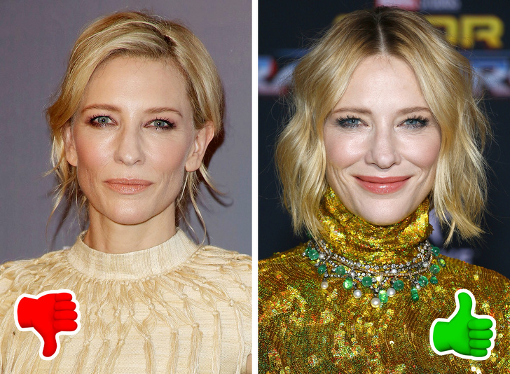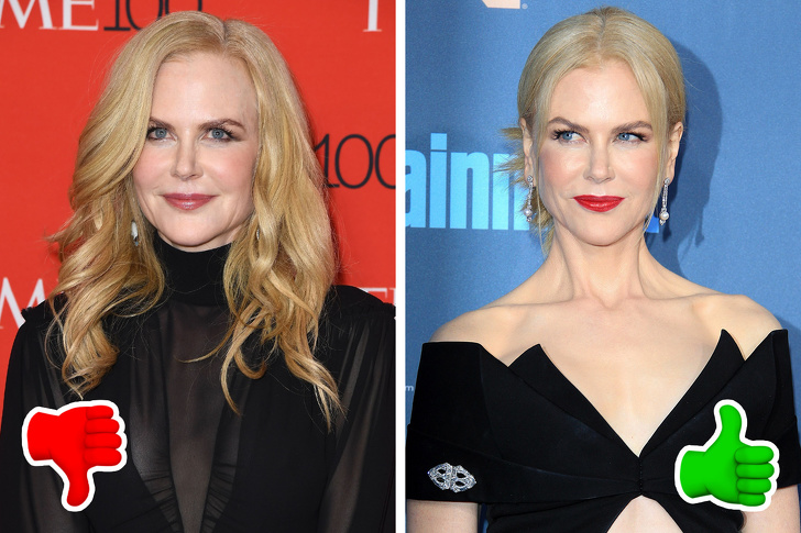 Якщо ви дуже любите чорний колір або вам його не уникнути на важливих заходах, де є дрес-код, просто приберіть чорний подалі від обличчя. Можна відокремити чорний іншим, світлим або яскравим, що підходить вам відтінком, або відкрити шию і зону декольте, як на фото вище.
