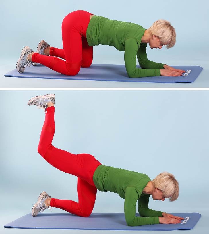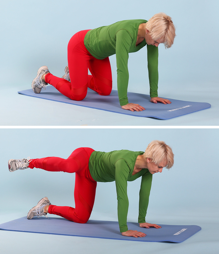Виконання. Витягніть одну ногу назад і підніміть на рівень тазу, спина повинна бути прямою. Щоб утримати рівновагу, краще напружити м'язи преса. Робити це зручніше на видиху. Повторіть те ж саме з іншою ногою.