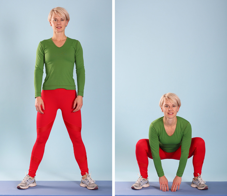 Виконання. Повільно сідати, переносячи вагу тіла на п'яти і нахиляючи спину вперед. Для підтримки хребта варто напружити прес. Для перенесення навантаження на сідниці потрібно зберігати природний прогин спини в районі попереку. Коліна і стегна при присяд не повинні виходити за ступні, їх треба розводити в сторони.
