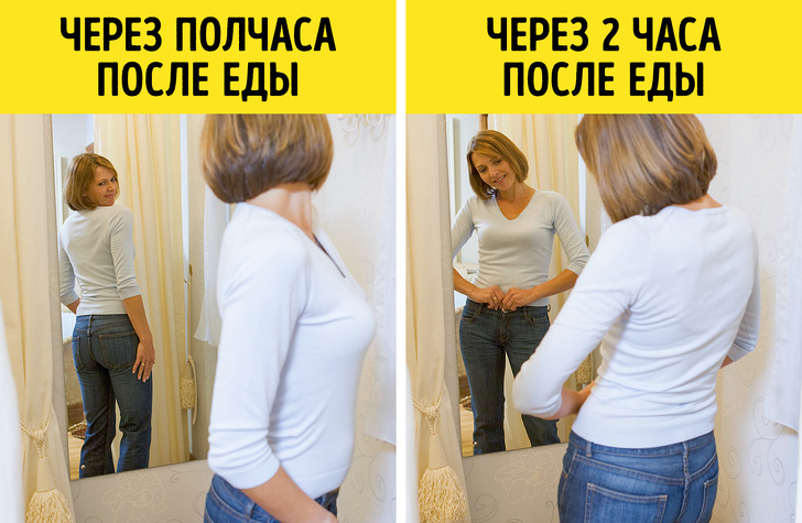 Ви коли-небудь стикалися з такою проблемою: купили джинси, які ідеально сиділи на вас в примірювальній, але, надівши їх на наступний день, помітили, що вони занадто вільні в районі талії? Можливо, справа в тому, що ви придбали їх відразу ж після щільного прийому їжі. Щоб уникнути подібних несподіванок, ходите в магазин не раніше, ніж через кілька годин після їжі.