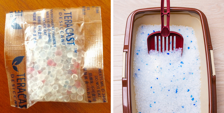 Невеликі пакети з круглими кульками, які виробники вкладають в коробки з нової взуттям, стануть в нагоді для боротьби з запахом у взутті старої. Матеріал, з якого складаються кульки, називається силікагель: він вбирає і утримує вологу. Для цих цілей підійде в тому числі і наповнювач для котячого лотка з силікагелю. Візьміть 1-2 ст. л. наповнювача і залиште його у взутті на ніч — до ранку запах зникне.