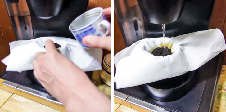 Реальність: мабуть, один з найбільш неоднозначних лайфхаков, які нам зустрічалися. Головне питання, яке виникає при погляді на це дійство: «Навіщо?». Використання кавоварки не за призначенням може пошкодити апарат. Ну а про каву з ворсинками ми тактовно промовчимо — можливо, це частина рецепта.