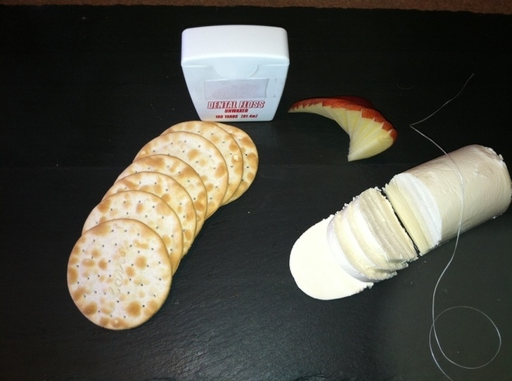 Очікування: деякі продукти (м'який сир або свіжий бісквіт) жахливо складно розрізати ножем. Якщо ви не шеф-кухар, звичайно. А якщо застосувати для цього зубну нитку, то нарізка пройде легко і продукти не раскрошатся.