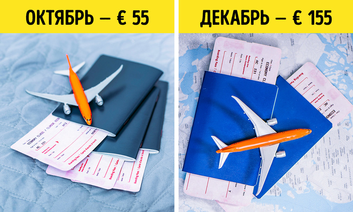Рання покупка квитків на літак чи поїзд дозволить значно заощадити. У жовтні багато компаній встановлюють адекватні ціни і влаштовують акції. А ось до грудня ціна зросте, і доведеться вибирати не зручні місця та відповідні дати, а ті, що залишаться. Аналізи продажу авіаквитків показують, що найвигідніші квитки з'являються на сайтах приблизно за 3 місяці, а найбільше зростання цін спостерігається в останній тиждень перед вильотом.
