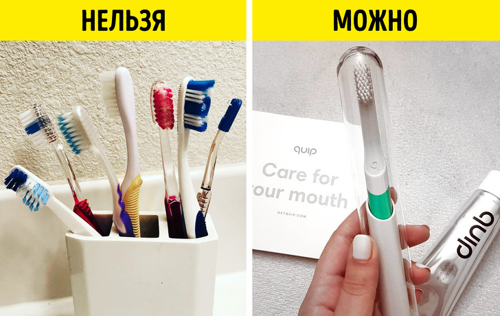 Здавалося б, а де ж ще місце зубних щіток, як не у ванній? Але мова в даному випадку йде конкретно про суміщених санвузлах. Дослідження говорять про те, зберігання зубної щітки у ванній кімнаті з унітазом може бути небезпечно для здоров'я. Справа в тому, що на неї можуть потрапити бактерії, які піднімаються в повітря при зливі води в унітазі з відкритою кришкою. Якщо у вас суміщений санвузол, краще знайти більш захищене місце для щітки, наприклад, в спальні або на кухні, або зберігати її в спеціальному футлярі або ковпачку.