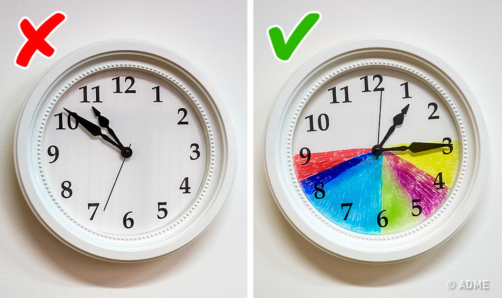 Звичайні годинник і кольорові маркери можуть навчити ваших дітей основ тайм-менеджменту. Прикрасьте сегменти на годиннику в різні кольори, які будуть позначати певну справу: з 5 до 6 — уроки, з 6 до 7 — вечеря та допомога по дому і т. д. Поясніть це дитині. З такими годинами йому буде набагато простіше дотримуватися режиму дня.