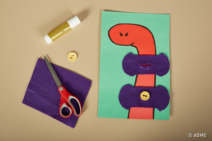 Щоб наочно показати малюкові, як застібати та розстібати гудзики, можна зробити ось таку цікаву саморобку. Вирізаємо з кольорового паперу черв'ячка, потім пришиваємо гудзики і приклеюємо шматочки фетру з надрізами.