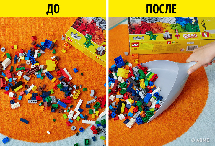 Деталі лего, кубики та інші дрібні іграшки приносять багато незручностей: наші ніжні батьківські стопи то і справа несподівано нападають на них, та і збирати сотні крихітних деталей дуже утомливо. Звичайний совок допоможе швидко прибрати безлад з підлоги. Ну чому ніхто не сказав про цього геніального трюку раніше?