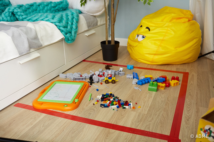 Діти обожнюють розкидати іграшки по всьому будинку. Щоб вся сім'я не спотикалася, спробуйте наступний трюк: виділіть у будинку зону, де дитина може спокійно грати, і обклейте цю ділянку яскравим скотчем. Поясніть малюкові, що тепер у вашому будинку діє правило: іграшки не можна розкидати за межі лінії.