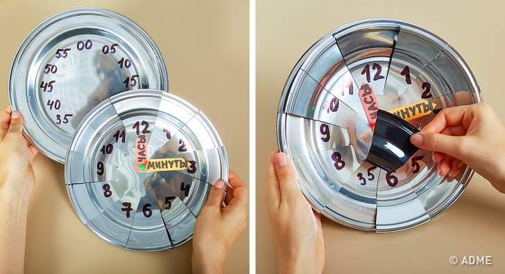 Тепер без праці можна по черзі відгинати секції верхньої тарілки і показувати дитині, як під циферблатом з годинником ховається циферблат з хвилинами.