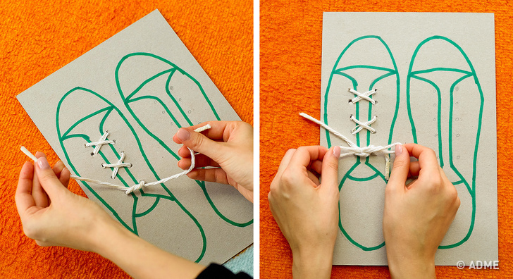 А якщо намалювати черевики на картоні, зробити в ньому шилом отвори і протягнути в них шнурки? Такий тренажер зручно брати з собою: взуття не буде розкидана по всьому будинку, не доведеться стежити, чи чисті черевики схопив дитина, а заодно можна самому вивчити нові способи шнурування.