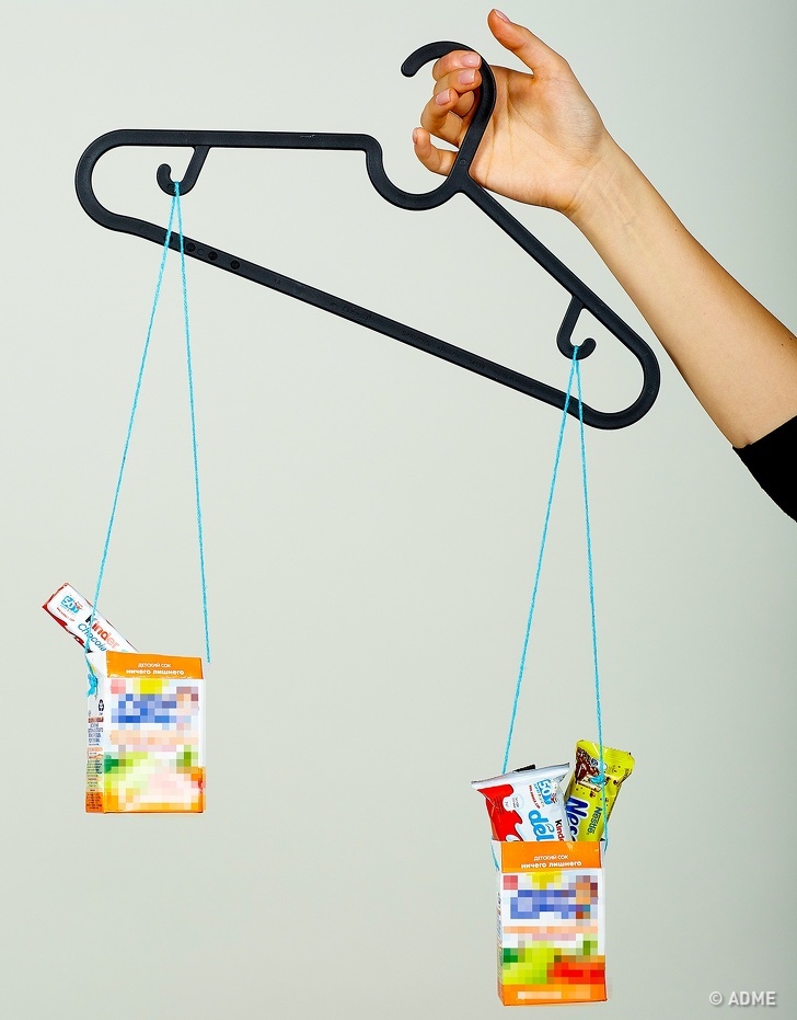 Візьміть звичайну вішалку-плечики і два однакових контейнера, наприклад упаковки з-під соку або одноразові стаканчики. Виконайте два отвори в кожній ємності, вставте в них мотузку і прикріпіть до вішалки. Уравновесьте отримані ваги і покладіть в кожну чашу печиво, цукерки чи шоколадки, за які ведеться суперечка. Тепер діти своїми очима побачать, що означає ділити все порівну, і нарешті перестануть сперечатися, кому дісталося більше солодощів.